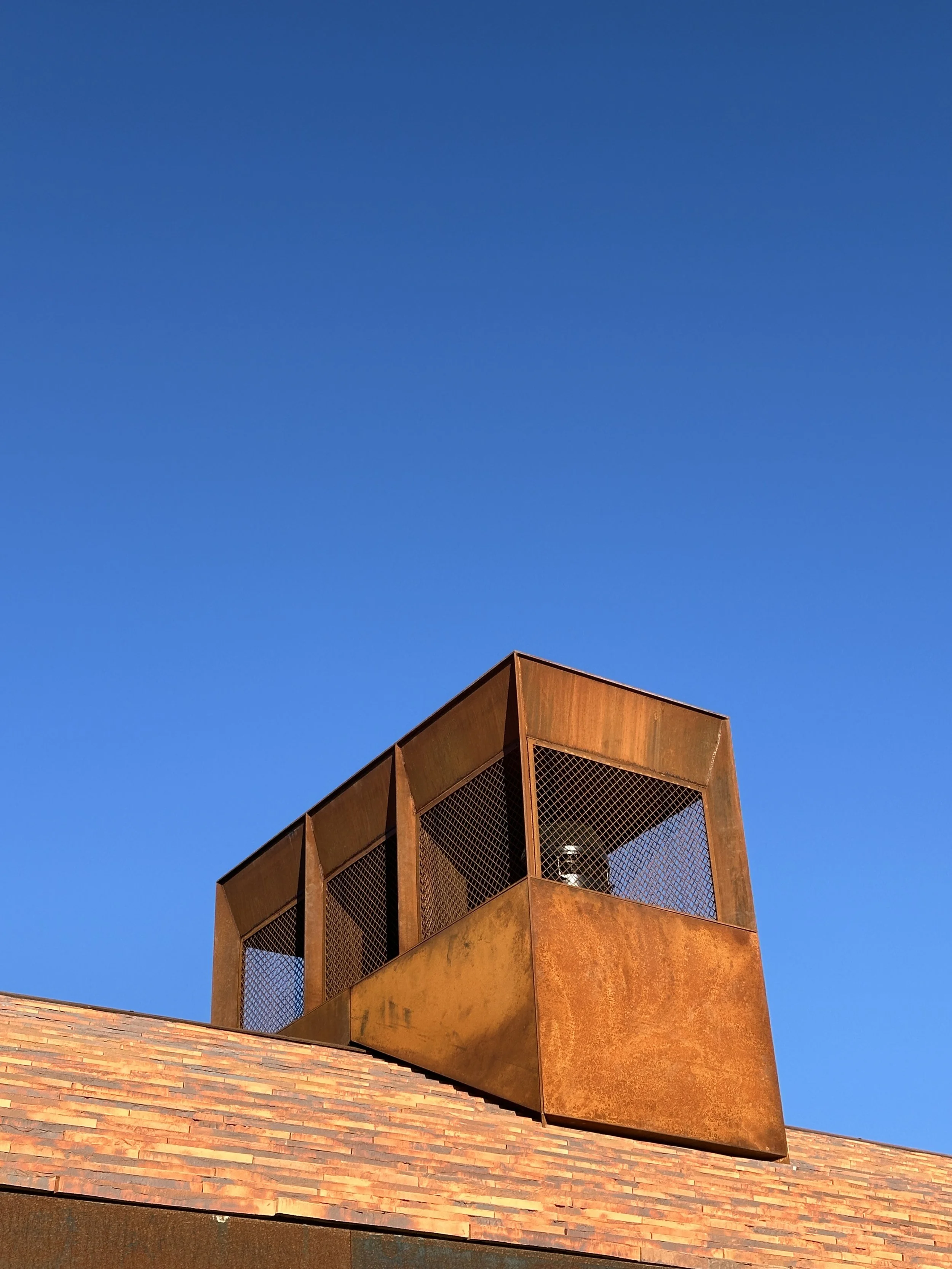 The weathering steel chimney perched on top of handmade tiles. This chimney seamlessly integrated all of the functional requirements blending form and function.